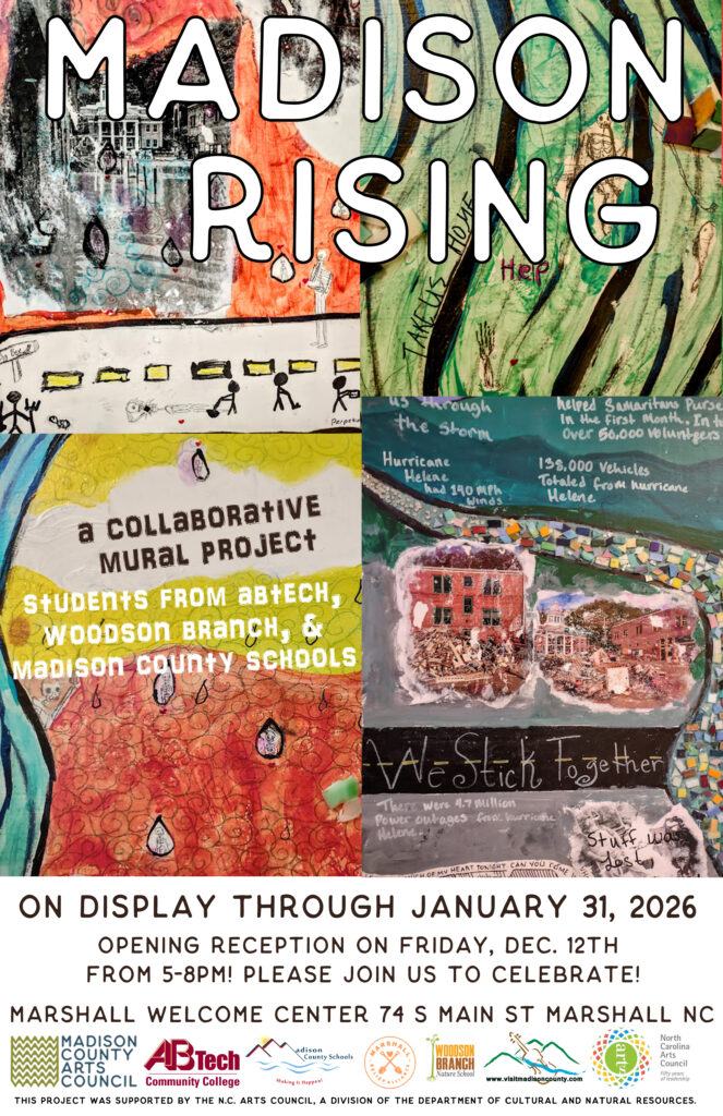 Introducing “Madison Rising” a collaborative mural project started in Rachael Kerley’s ART course at AB-Tech’s Madison County Campus on the one-year anniversary of Helene. Supported by the Marshall Relief Alliance, this student designed and student made mural celebrates creative collaboration and community resilience after a natural disaster.